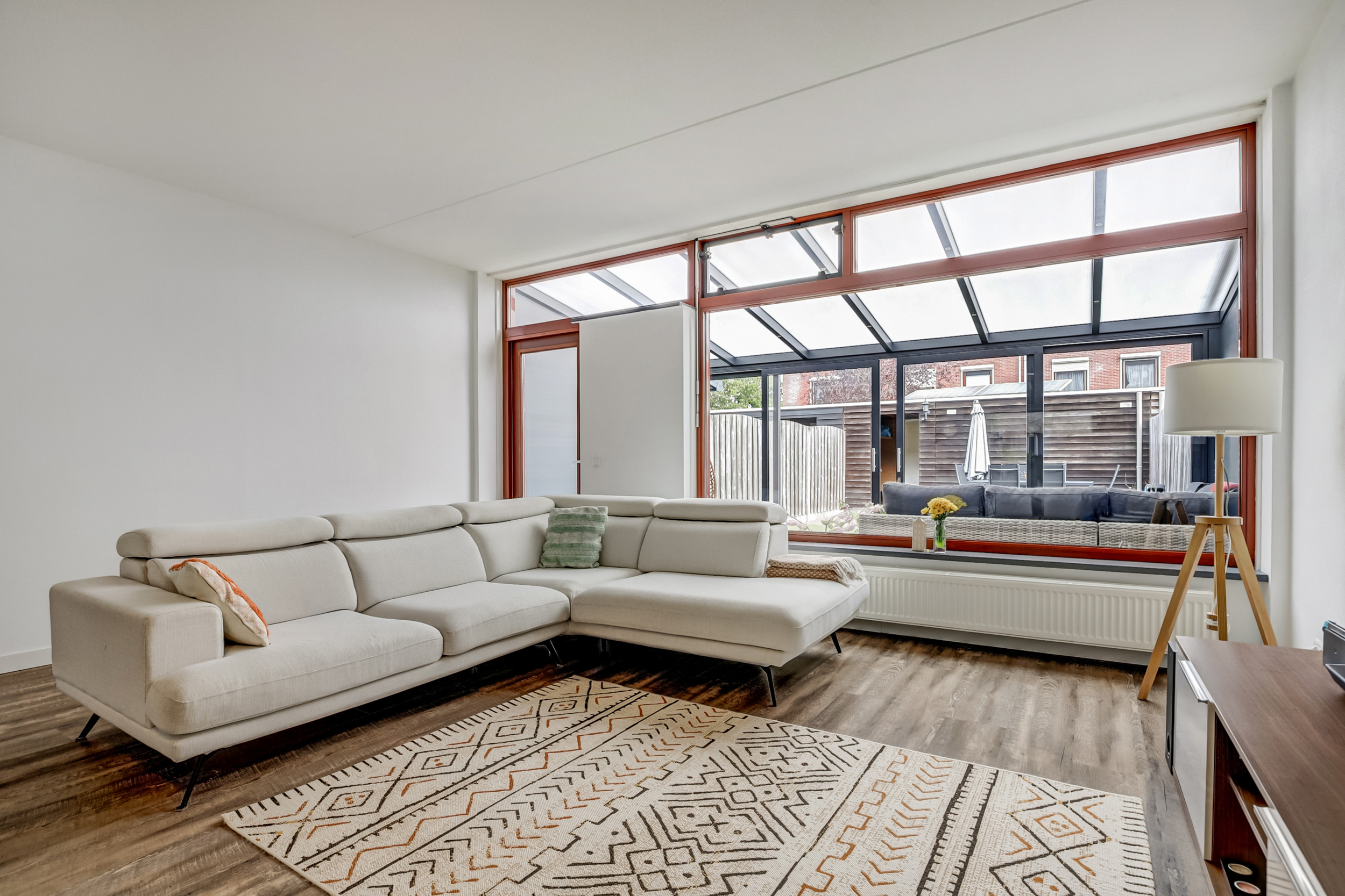 Je komt binnen in de ruime entree met garderobekast, meterkast, trapopgang en modern toilet. De woonkamer is licht en ruim, met grote ramen aan voor- en achterzijde. Aan de tuinzijde vind je een schuifpui die overgaat in de veranda – ideaal voor zomeravonden. De halfopen keuken (2019) is voorzien van hoogwaardige inbouwapparatuur en een open verbinding naar de eethoek.